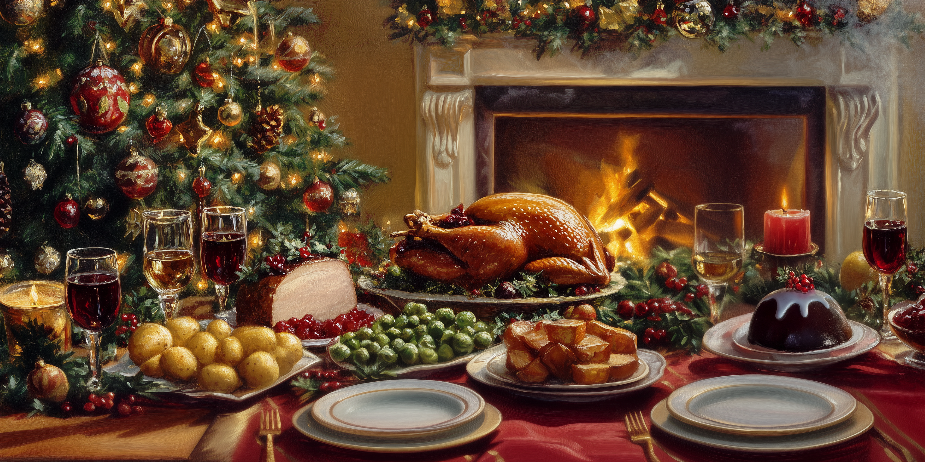 The smell of roasted turkey fills the air, mingling with the warm, spicy notes of Christmas pudding and the sweet tang of cranberries. The table is set, adorned with sparkling wine glasses, golden-roasted potatoes, and a vibrant wreath of holly in the center. By the crackling fireplace, a grand Christmas tree glows with twinkling lights and shimmering ornaments, casting a soft, festive glow across the room. This is the heart of Christmas – a joyous gathering of family and friends, full of laughter, love, and the warmth of a holiday feast.