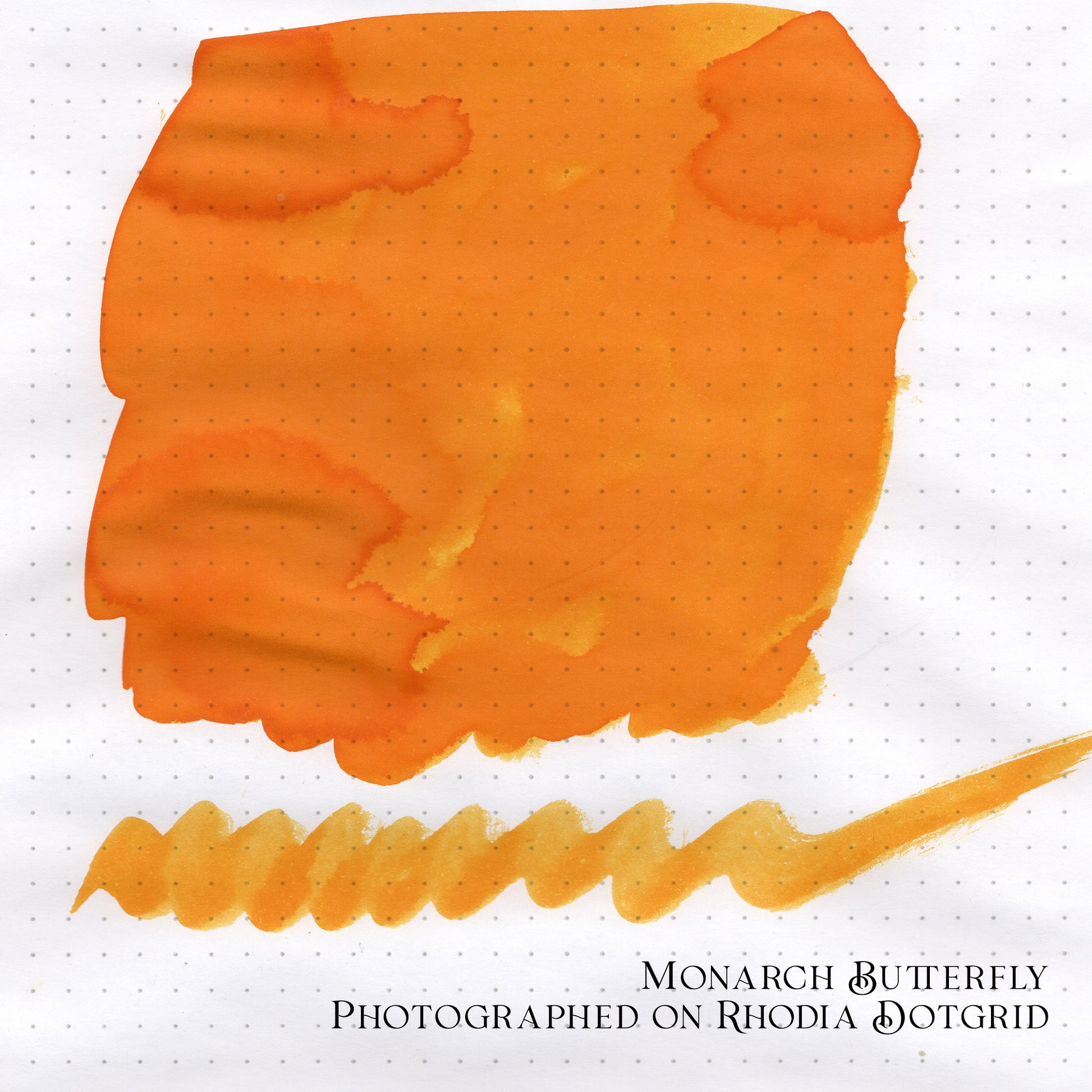 Monarch Butterfly is a radiant, yellow-orange fountain pen ink with exceptional shading and saturated vibrancy. Designed for writers who want their words to leap off the page, this ink offers a powerful legibility even in finer nibs, yet still produces nuanced transitions from deep golden amber to fiery orange in broader strokes.