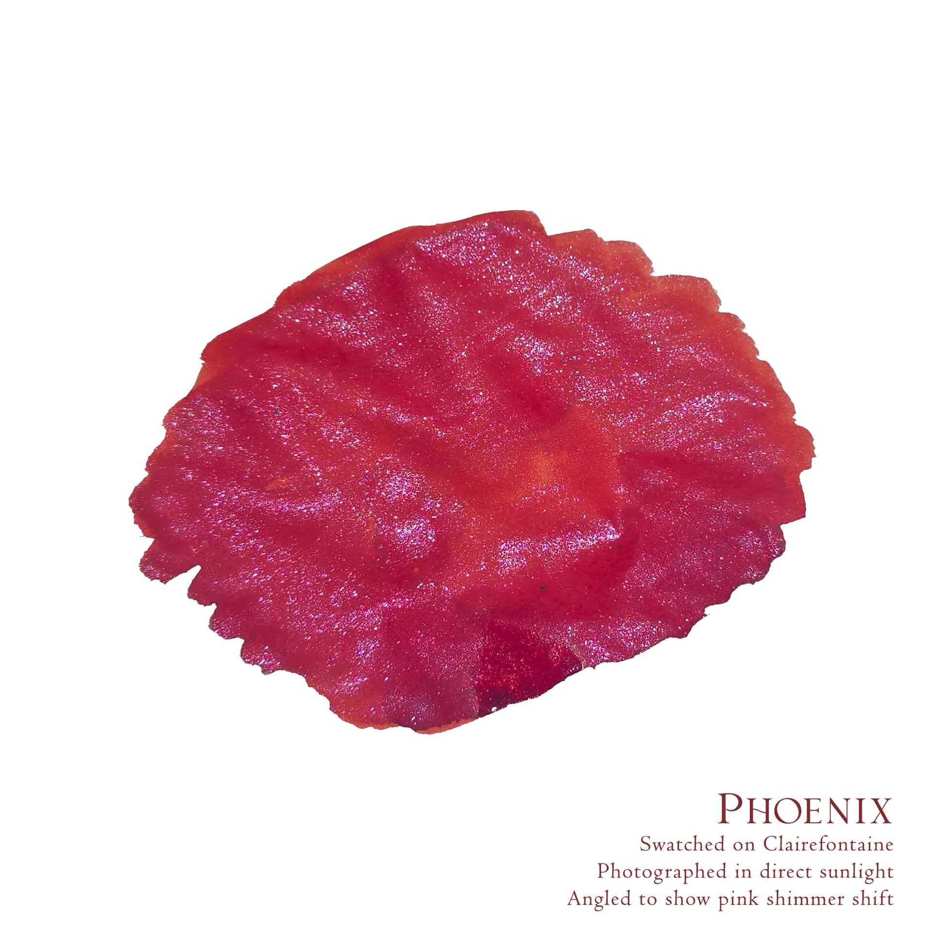 At first glance, Phoenix presents as a deep, embered red. Warm, saturated, and weighty, like heat held just beneath the surface. As the ink settles, its complexity reveals itself. Currents of molten pink and smouldering rose move through the base, while darker wine-red pools gather at the edges. On receptive papers, subtle olive-gold sheen emerge, echoing ash, metal, and the remnants left behind after fire has passed.
