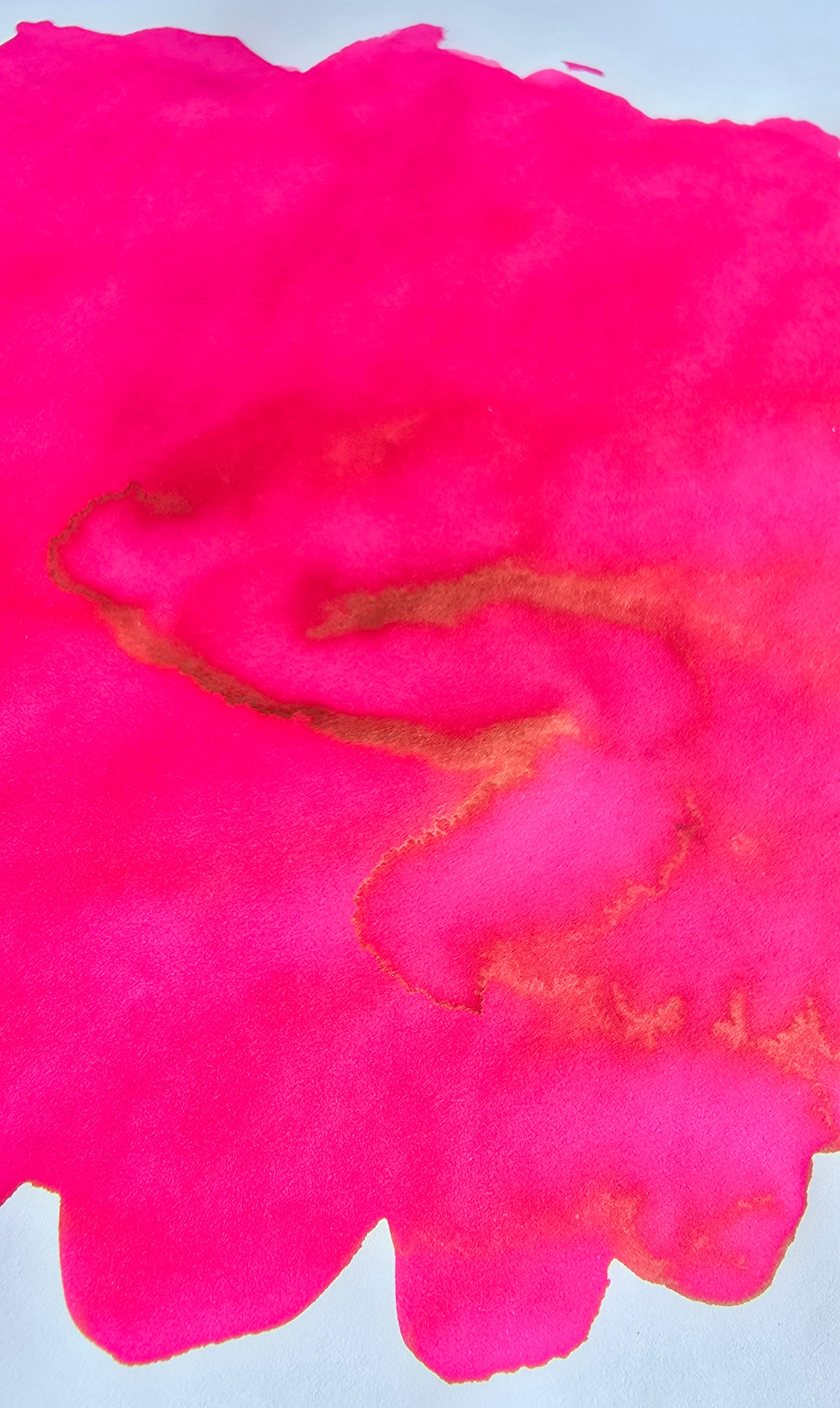 A saturated crimson-pink base dominates the page, with a subtle golden sheen emerging where ink pools and edges form. The swatch shows high intensity colour with soft transitions and flashes of warmth that recall sunlight on petals and sea spray.