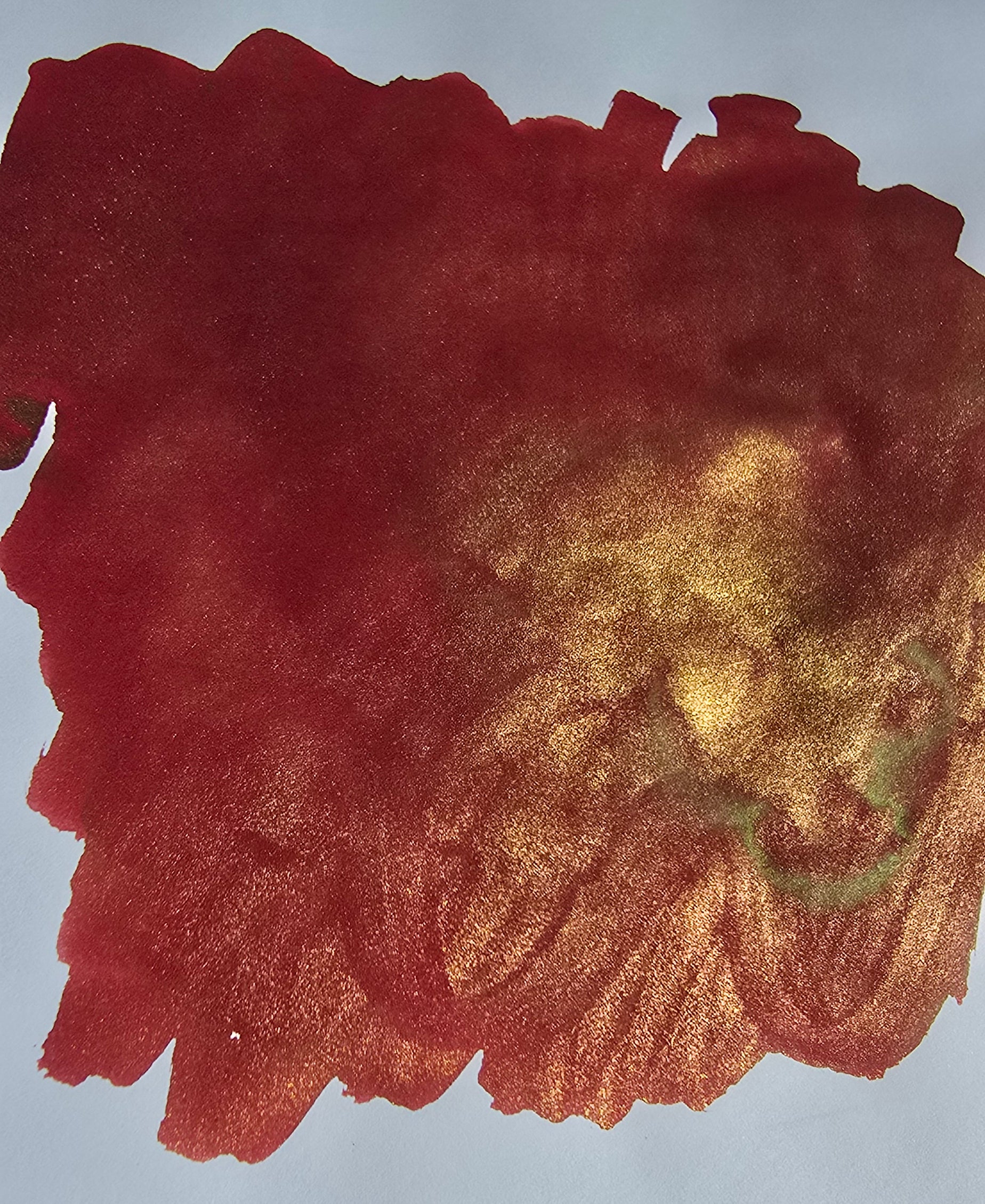 A deep ruddy red base is infused with a rich copper shimmer that blooms in heavier applications. In the swatch, metallic warmth gathers like molten light beneath the surface, shifting between ember, bronze, and gold depending on angle and saturation.