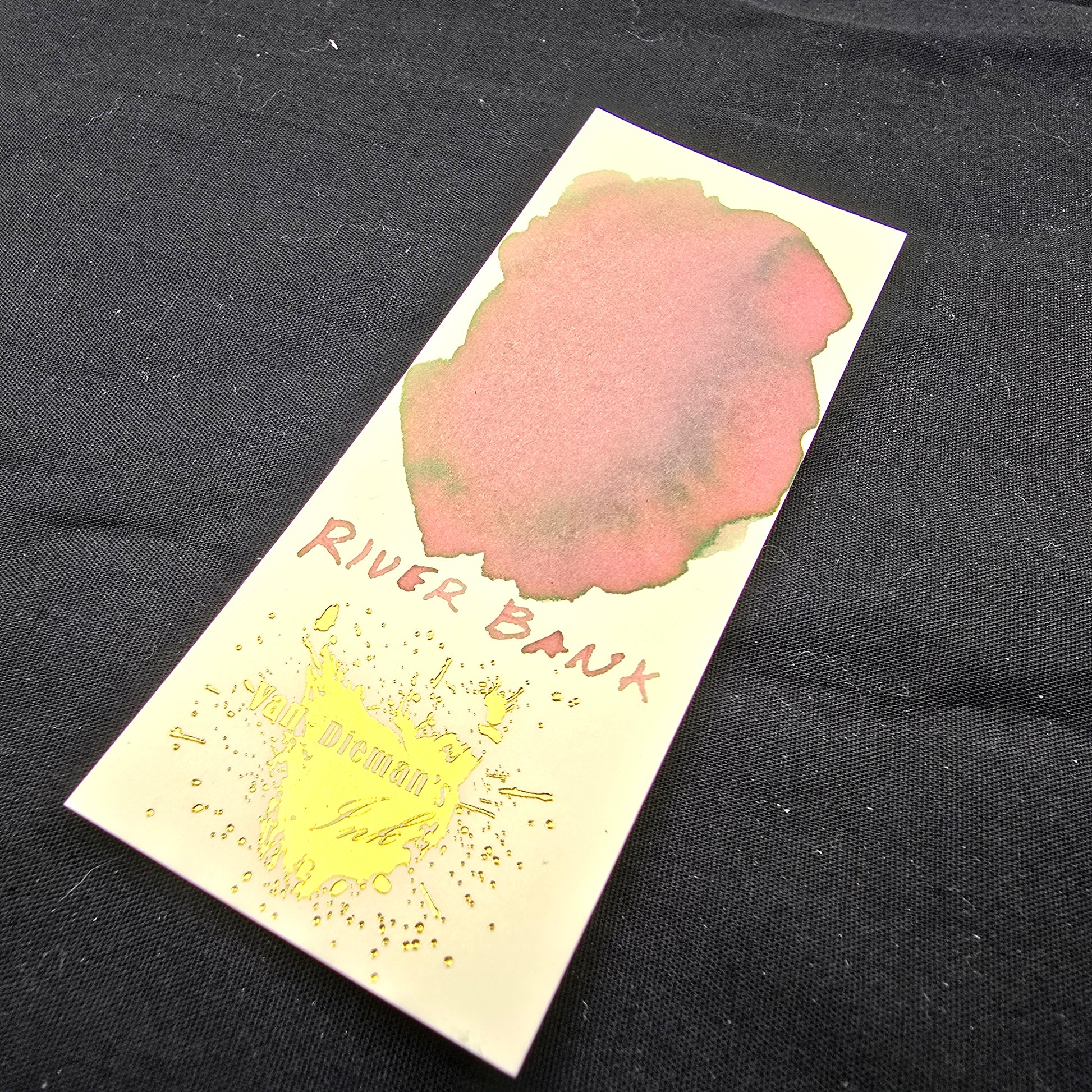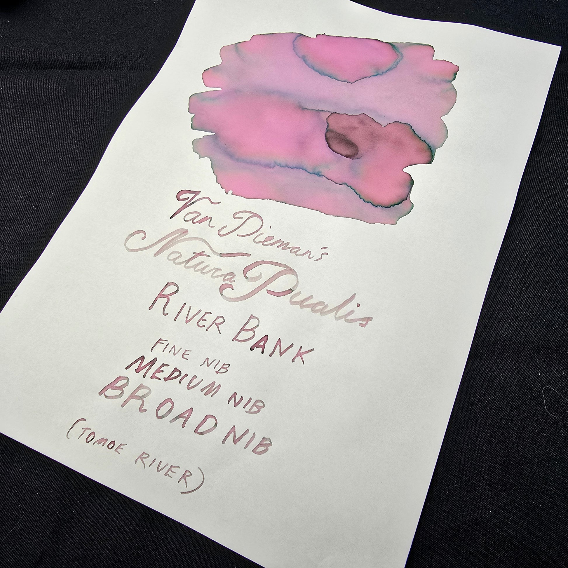 The ink itself reflects this rich balance. A ruddy umber base gives way to swirls of aquatic blue, earthy pink and mossy green and flashes of muted violet, depending on paper and pen. It separates with complexity, creating stunning chromatographic spreads and organic texture. Whether laid down wet and heavy or drawn out fine and light, River Bank reveals something new every time.