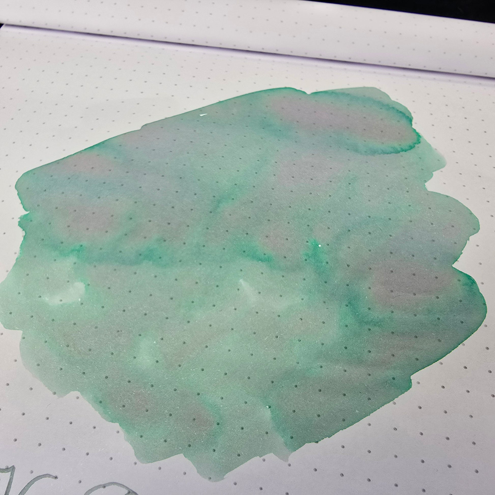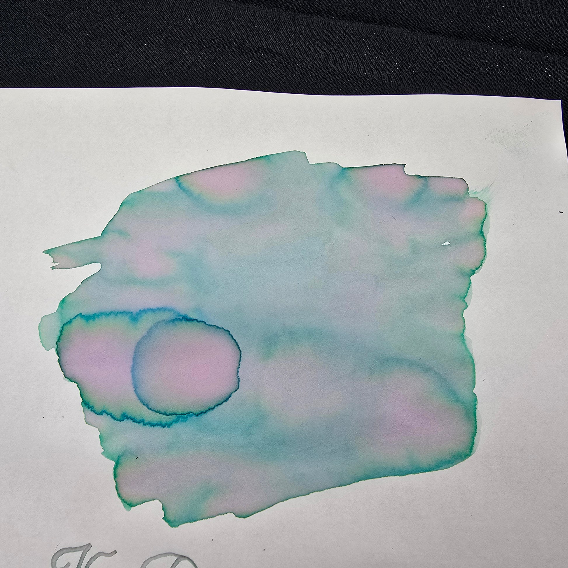 This ink carries a delicate seafoam green base, split by blooming lavender-pink hues and edged with cool marine blue. In broader swatches, it reveals luminous haloing and soft internal textures — like sunlight refracting through mist. On Tomoe River and Clairefontaine, expect soft rivers of colour that shift tone mid-stroke; in writing, it remains legible but uniquely atmospheric.